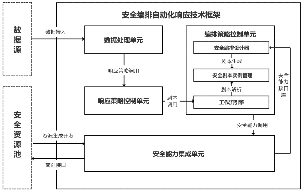 安全编排自动化响应参考架构至少包括数据处理单元、响应策略控制单元、编排策略控制单元、安全能力集成单元。