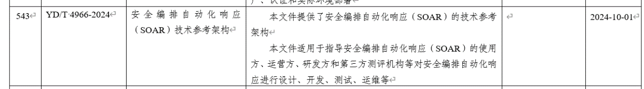 近日,工业和信息化部公告(2024年第18号)批准发布了多项行业标准,由中国通信标准化协会提出并归口,安恒信息牵头制定的YD/T 4966-2024《安全编排自动化响应(SOAR)技术参考架构》发布,并将于10月1日正式实施。