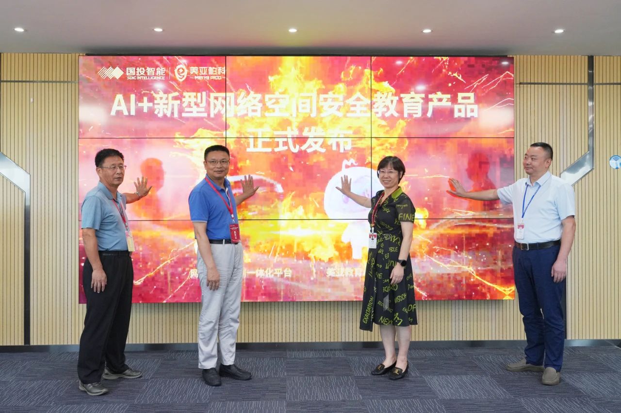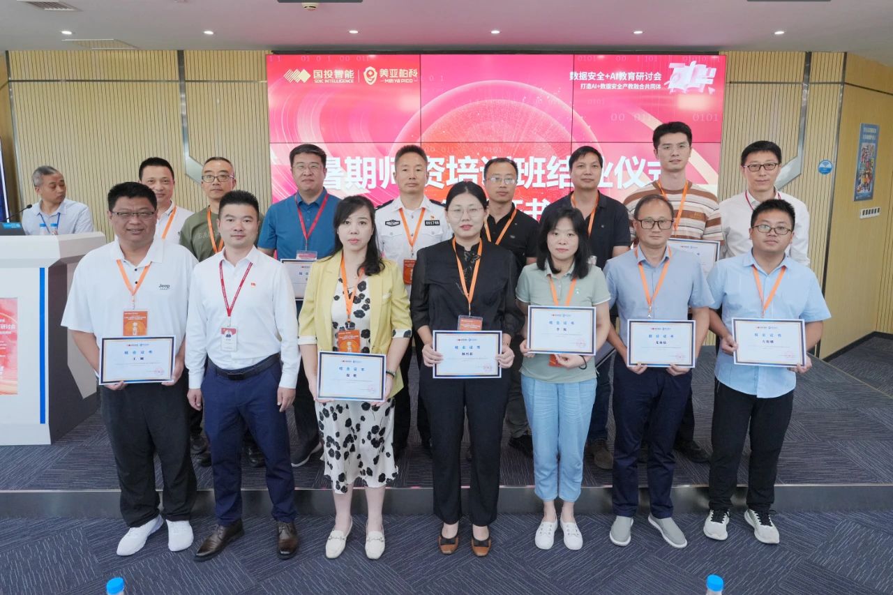 研讨会期间同步举办国投智能AI+教育产品发布会及暑期师资培训班结业仪式。国投智能常务副总经理栾江霞、山东大学副校长周加强、泉州信息工程学院软件学院院长周宏博、美亚柏科教育事业线总监宋桥白共同发布新品网络安全演训一体化平台以及美亚教育AI教学助手。