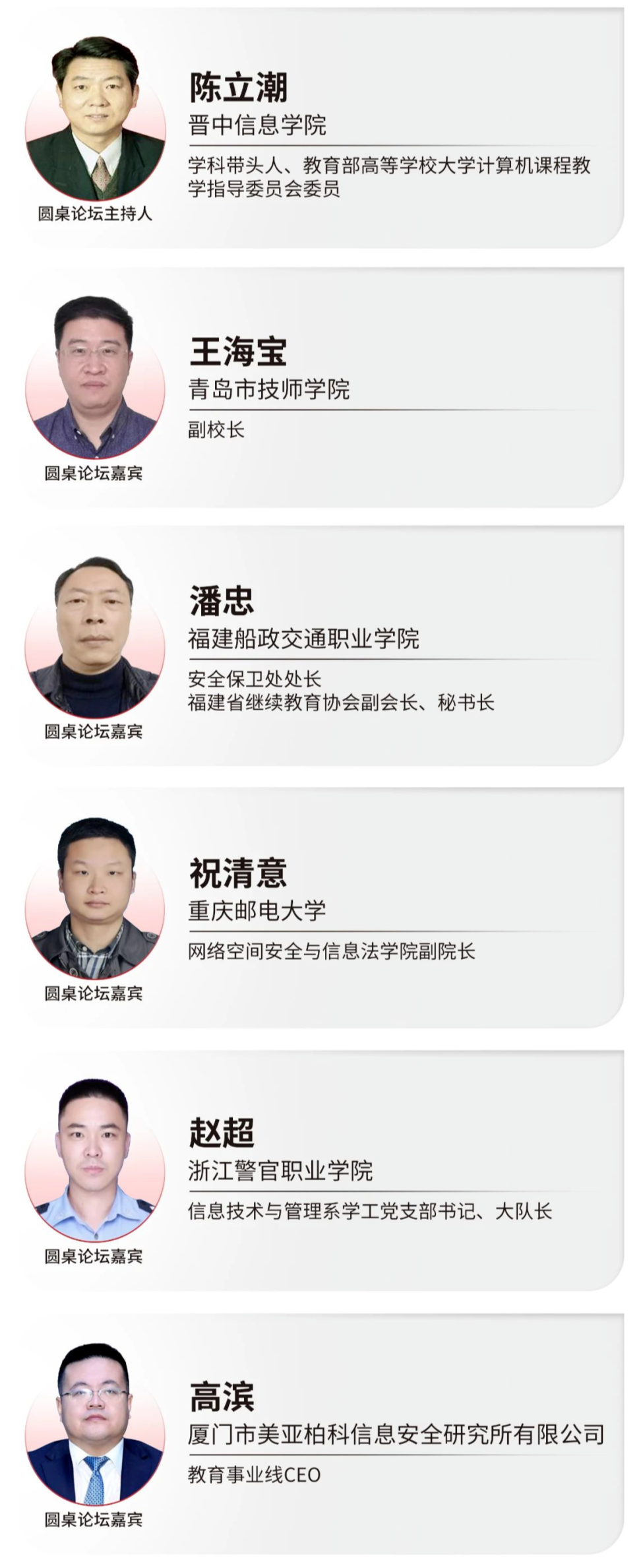 研讨会设置“智启未来:AI赋能下的数据安全产教融合新征程”主题圆桌论坛环节。该环节由教育部高等学校大学计算机课程教学指导委员会委员陈立潮教授主持,来自各高校、执法单位、企业的5位专家学者展开热烈讨论。